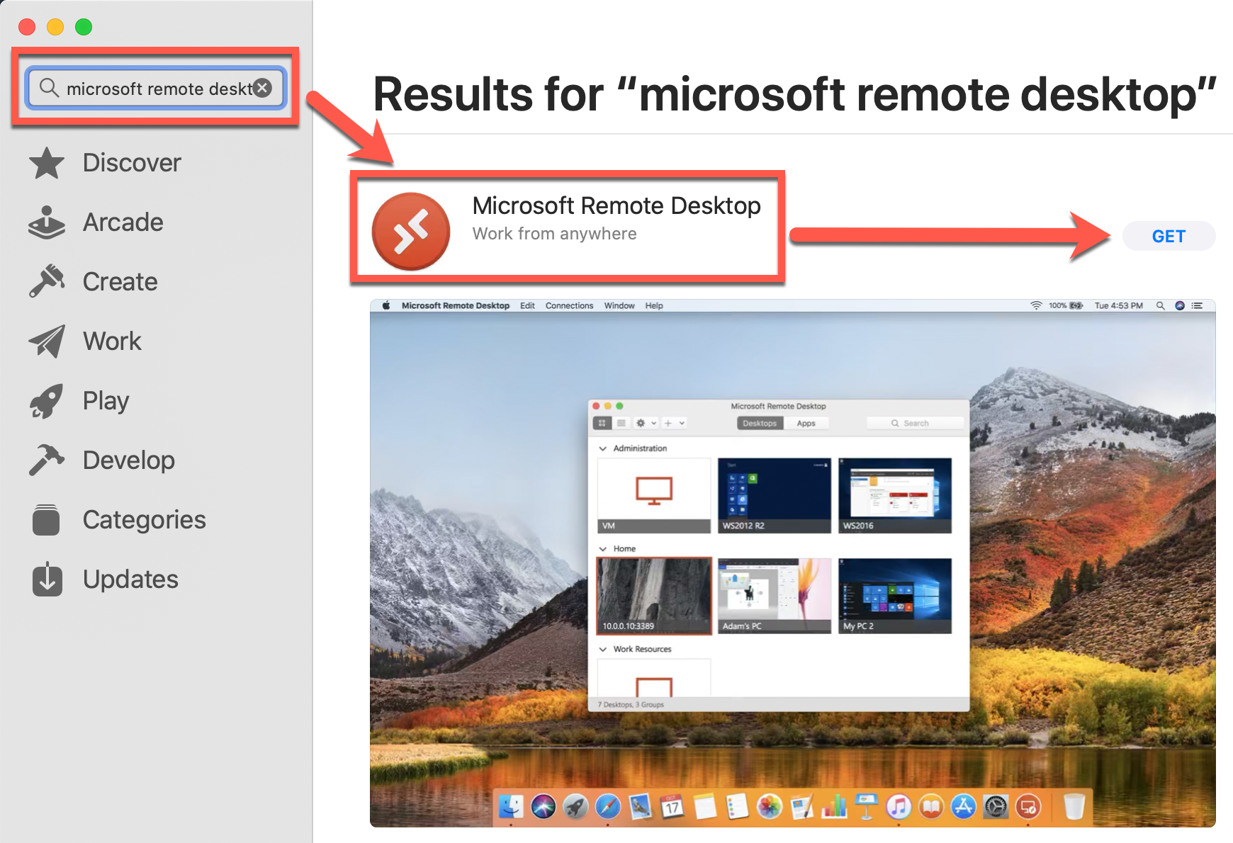 To connect to the Laboratory you will need the Microsoft Remote Desktop application. Run App Store, type "microsoft remote" in the search box and click the Get button. Follow the installation instructions.