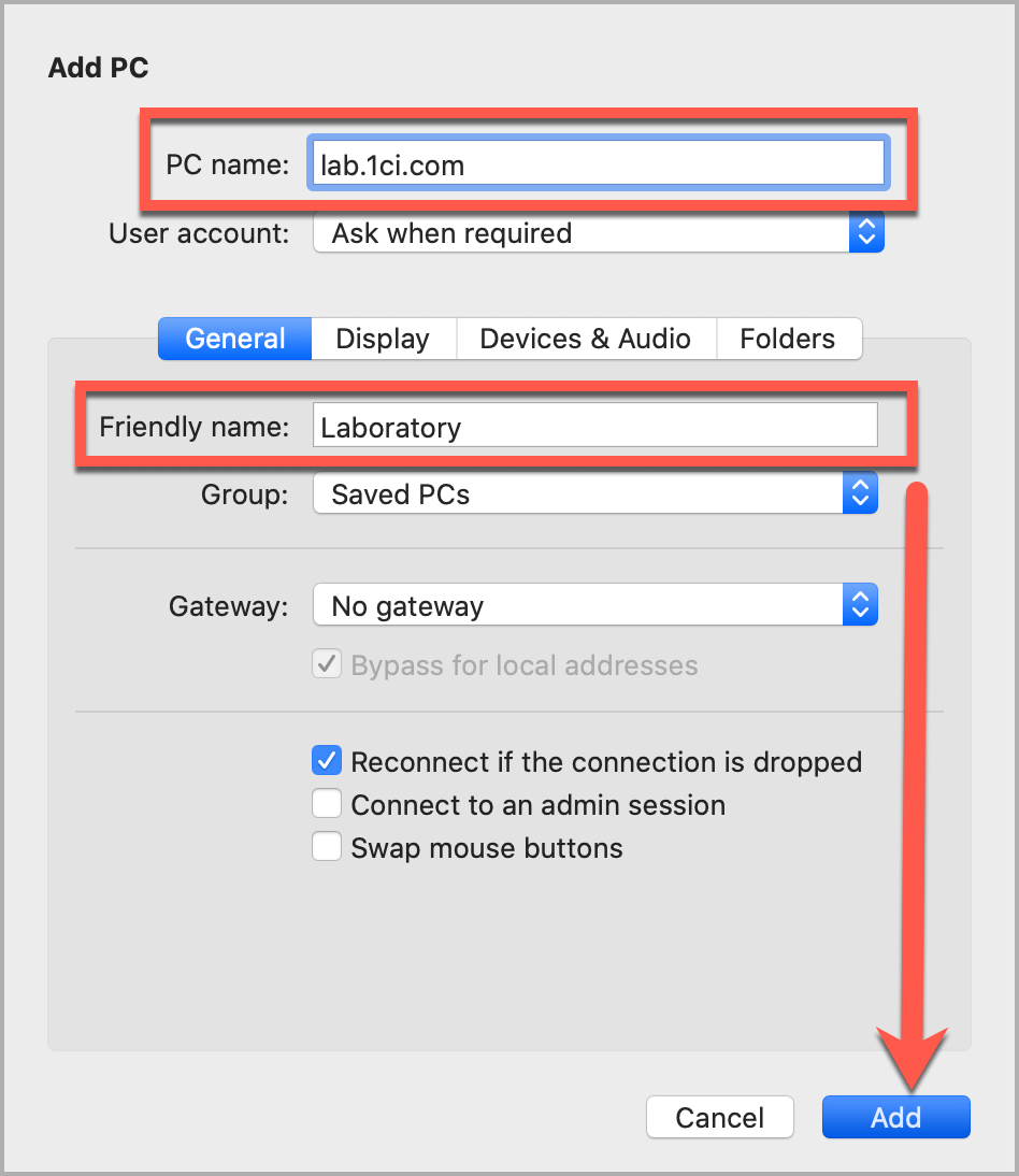 Click the Add button, enter "lab.1ci.com" in the PC name field. We also recommend you type in "Laboratory" in the Friendly name field. Then click Add.