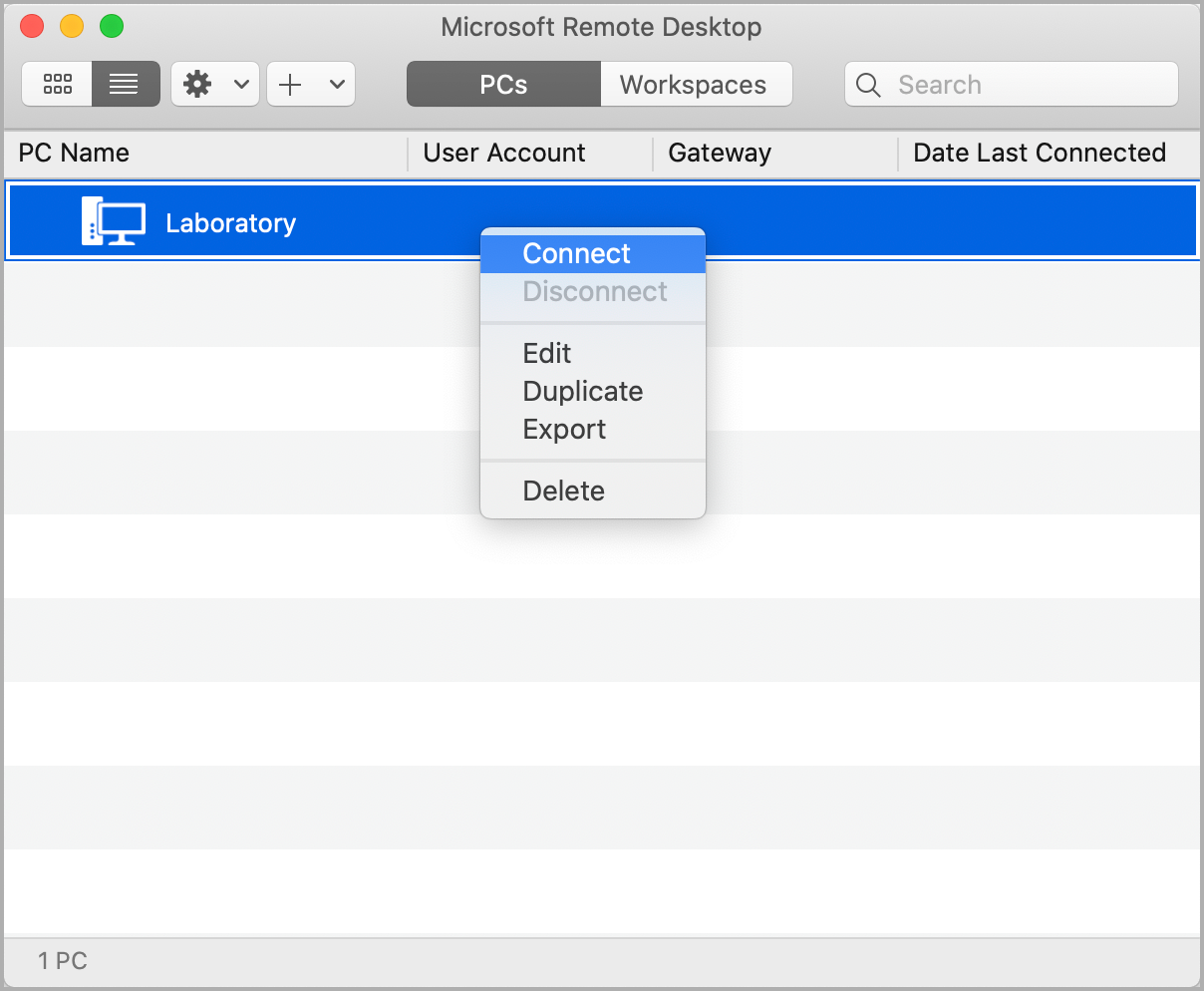 Select the Connect item in the drop-down menu or double-click the Laboratory list entry to establish a remote connection.